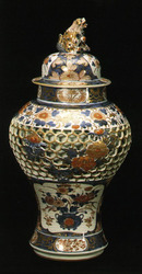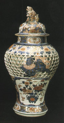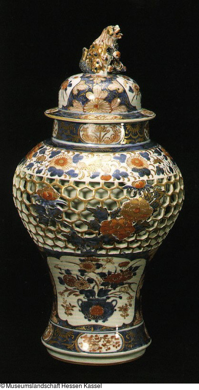 Der flache Standring trägt keinerlei Dekor. Der leicht ausschwingende Fuß zeigt auf blauem Fond mit goldenem Chrysanthemendekor länglich ovale ausgesparte Reserven, die abwechselnd blühende Prunuszweige und stilisierte Tulpen auf weißem Grund tragen. Abgesetzt durch eine blaue Doppellinie schließt sich ein breites Dekorfeld an mit großen weißgrundigen Kartuschen auf blauem Fond mit Chrysanthemen. Die Kartusche ziert ein Blumenarrangement in einer Vase, die im Stile alter Bronzegefäße geformt ist. Die Schulterpartie ist doppelwandig gearbeitet. Über einem weißen Vasenkörper liegt in 2-3 cm Abstand die tortoise-shell-förmige Außenwandung mit dem scheibenartigen Motiv des Sanraku-Löwen in den Farben Blau, Gold und Eisenrot. Die Rückseite ziert ein Arrangement von Päonien und Chrysanthemen. Darüber breitet sich ein schmaleres, weißgrundiges Band mit rot-goldenen Chrysanthemen und blau-goldenem Blattwerk aus. Die Halszone übernimmt den Dekor der Fußzone. Der Deckelrand wiederholt ihn ebenfalls, während die Deckelwölbung die Partie mit den Kartuschen kopiert. Der Fo-Hund mit geöffnetem Maul thront als Knauf obenauf.