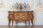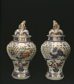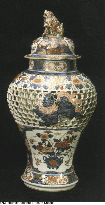 Der flache Standring trägt keinerlei Dekor. Der leicht ausschwingende Fuß zeigt auf blauem Fond mit goldenem Chrysanthemendekor länglich ovale ausgesparte Reserven, die abwechselnd blühende Prunuszweige und stilisierte Tulpen auf weißem Grund tragen. Abgesetzt durch eine blaue Doppellinie schließt sich ein breites Dekorfeld an mit großen weißgrundigen Kartuschen auf blauem Fond mit Chrysanthemen. Die Kartusche ziert ein Blumenarrangement in einer Vase, die im Stile alter Bronzegefäße geformt ist. Die Schulterpartie ist doppelwandig gearbeitet. Über einem weißen Vasenkörper liegt in 2-3 cm Abstand die tortoise-shell-förmige Außenwandung mit dem scheibenartigen Motiv des Sanraku-Löwen in den Farben Blau, Gold und Eisenrot. Die Rückseite ziert ein Arrangement von Päonien und Chrysanthemen. Darüber breitet sich ein schmaleres, weißgrundiges Band mit rot-goldenen Chrysanthemen und blau-goldenem Blattwerk aus. Die Halszone übernimmt den Dekor der Fußzone. Der Deckelrand wiederholt ihn ebenfalls, während die Deckelwölbung die Partie mit den Kartuschen kopiert. Der Fo-Hund mit geöffnetem Maul thront als Knauf obenauf.