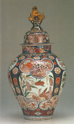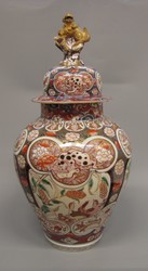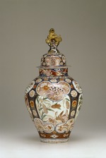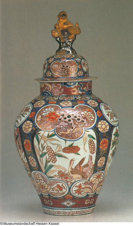 Gebauchte Deckelvase mit Fohhunden. Der Fußring mit rotem Schotenmuster auf weißem Grund, anschließend tiefeisenroter Rand mit ranken- und blütenbesetzten Rhomben und ovalen Feldern. Auf dem Korpus vier Felder mit Vogeldarstellungen und grünem Blatt- und Blütenwerk. Felder getrennt durch streifenartige Muster mit rosa und eisenroten Blumen mit goldenen Blättern auf unterglasurblauem Grund. Diese schmalen Zwischenfelder trennen auch die über den Vogelfeldern liegenden weiteren vier Felder, abwechselnd je zwei Felder mit Drachen und eisenroten Blüten auf goldenem Grund und je zwei Felder mit rosa und eisenroten Schmetterlingen über grünem Schilf und eisenroten und goldenen Blüten auf weißem Fond. Unterhalb des Vasenrandes zwölf Felder mit Golddekor auf weißem Grund. Deckel mit blauen goldgerandeten Ranken und rosa Drachen auf eisenrotem Grund. Im Deckelkörper vier Felder im Wechsel mit Schmetterlingen und Drachen. Unterhalb des Vorrandes gleiche Felderung wie auf dem Vasenkörper. Kleinere vergoldete Fohhunde.
