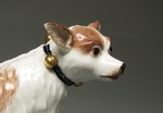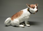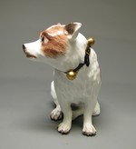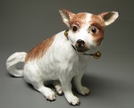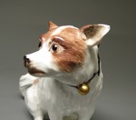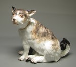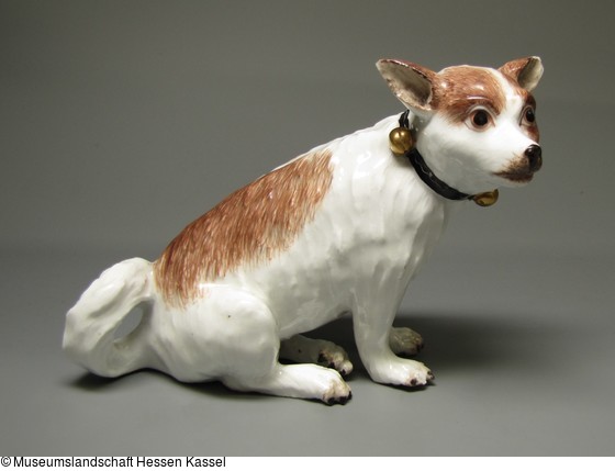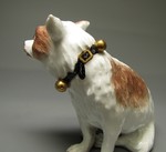 Wachhund sitzend nach rechts, Blick nach vorn gerichtet. Kurzhaarig braungefleckt. Schwarzes Halsband mit Schellen.
