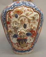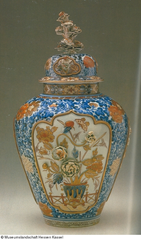 Deckelvase in Blau -Weiss mit Reliefrand umgebenen ausgesparten Feldern, in denen Reliefblumen in gemalten Vasen sitzen. Deckelbekrönung freigeformte Stengel mit Blumen, aussen Unterglasurblau Gold und Eisenrot.