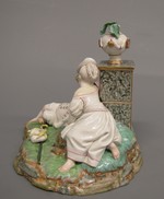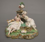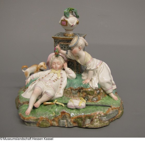 Kindlicher Schäfer schlafend, den Kopf gegen das Postament einer Blumenvase gelehnt. Rechts neben ihn knieend die ihn bekränzende jugendliche Schäferin. Tracht der Zopfzeit, weiss mit blauen und roten Randstreifen. Die Vase weiss mit grünem Blattgewächs. Das Postament grau mamoriert. Stab und Hirtentasche auf dem naturalistisch behandelten