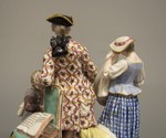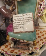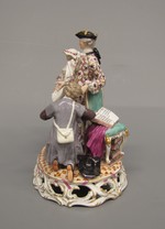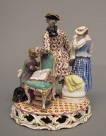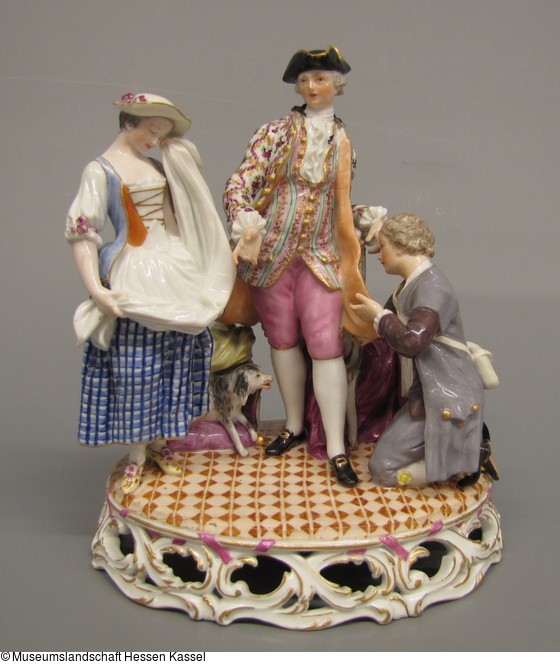 Figurengruppe auf durchbrochenem Sockel mit Ranken, die zwar sich aus Rocaillen noch entwickeln, aber sich trotzdem zur liegenden Art 7 x zusammenschliessen. In der Mitte ein jugendlicher Kavalier und Schlossherr, der sich auf einen Sessel stützt, unter und auf dem Bücher liegen. Zu seiner Linken kniet Lubin und fasst, Vergebung suchend, nach seinem Rock, der Hut liegt neben ihm auf dem Boden, die Botentasche trägt er auf dem Rücken. Zu seiner Rechten trocknet sich das ländlich gekleidete Mädchen Annette mit ihrer Schürze die Augen, ein Hündchen bellt aus einer eigens für ihn errichteten Hundehütte mit Kissen hinaus nach Lubin. Farben: weiss, Gold am Sockel mit Purpurbändern. Teppich in geometrischem Muster mit Bändern, Lilien und Rautenformen in Lederfarbe. Lubin hat grauen Überrock und bräunlich graue Jacke, schwarzen Hut, der Kavalier blasspurpur Escarpins, weisse Strümpfe, schwarze Schuhe, gestreifte Weste in Grün, Purpur und Gold. Überrock mit Ranken und Kirschzweigen in Purpur, Grün und Gold, schwarzen Dreispitz mit goldener Tresse. Annette in blaukariertem Rock, blassblauem Jäckchen und orangfarbenen Mieder, goldene Verschnürung am Latz und Purpurbändchen an Ärmeln und Hut.