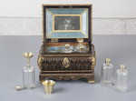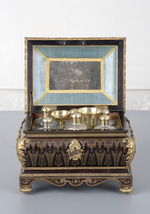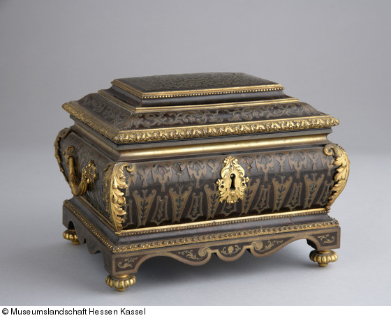 Reiche Prunkkassette in Boulletechnik als Reiseapotheke zur Aufnahme von sechs Glasflakons, einem Trichter und einem Trinkbecher. Das Korpus aus Eichenholz furniert mit Schildpatt und ornamentalen Messingeinlagen sowie reichen Bronzeappliken. Die Kassette auf einem Rahmen mit vier gedrückten und godronierten Kugelfüßen. Der Rahmen an den Zargen symmetrisch ausgeschnitten und mit Messingbändern gefaßt, die in der Mitte volutenförmig einschwingen. Darüber Bronzeleiste mit Perlschnur in doppelter Wellenranke sowie schildpattfurnierte Kehle und wieder bronzene Perlschnur. Der Mittelteil in Kissenform konvex auschwingend und nach oben über einer Schulter eingezogen. Reiche Messingintarsien. Die Ecken belegt mit bronzenem Blattwerk. Vorn und hinten Schlüsselbeschläge, von denen der hintere blind aufgelegt ist. An den Seiten gegossene Handhaben mit floralem Dekor. Über einer bronzenen Kehlleiste schwerer Deckel in einer Abfolge von Karnies, Kehle und einer kissenförmigen Deckplatte in Schildpatt und Messingornamenten, sowie dreier Bronzeleisten. In der Deckplatte Ornamente von gespiegeltem ''C''.