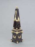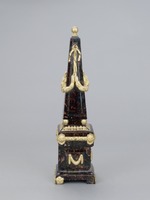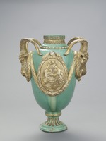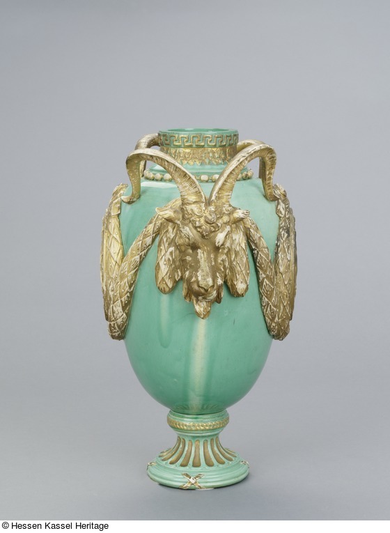 Hoher ovoider Vasenkörper auf kanneliertem Trichterfuß. Enghals mit umlaufendem Perlstab, Blattkranz und Mäanderband im Relief. Beidseitig der Wandung große, von Lorbeerkränzen gerahmte Medaillons mit auf Satyrn reitendem Liebespaar. Dazwischen große Steinbockköpfe als Handhaben. Reliefdekor kalt vergoldet.