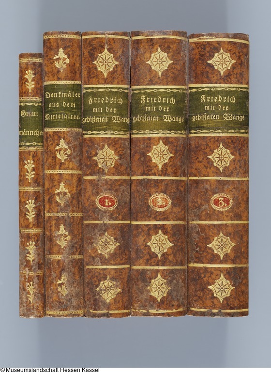 Hölzerne Buchattrappe in Blockform aus 5 fest miteinander verbundenen Einzelbüchern variierender Höhe. Die Vorderseite imitiert durch Abrundung und aufgeklebtes Papier, Lederrücken mit Goldprägung, die Seiten sind mit marmoriertem Papier verklebt. Horizontale Einteilung der Rücken in 6 Felder, die Felder mit goldgeprägten Motiven wie Blumen oder ornamentalen Formen. Oberseite mit farbigem Papier verklebt in Imitation von Blattschnitt. Buchtitel in Gold auf Grün, von links nach rechts lautend: