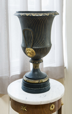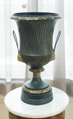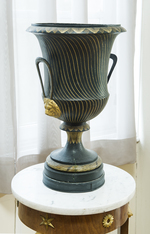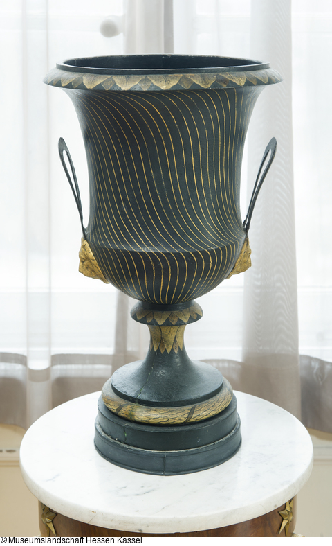 Kratervase aus dünnem Metall mit Holzfüßen und Blechuntersatz. Trichterfuß, einmal abgesetzt mit Wulstring, zum Vasenkörper hin scheibenförmig erweitert. Kelchförmiger Vasenkörper mit abgesetztem Bauch, an dem seitlich zwei schmale, hochgezogene Henkel angebracht sind, die an plastischen Löwenkopfmaskarons ansetzen.