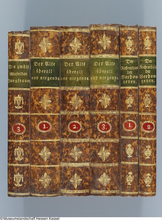 Hölzerne Buchattrappe in Blockform aus 6 fest miteinander verbundenen Einzelbüchern variierender Höhe. Die Vorderseite imitiert durch Abrundung und aufgeklebtes Papier, Lederrücken mit Goldprägung, die Seiten sind mit marmoriertem und hellbraunem Papier verkleidet. Horizontale Einteilung der Rücken in 6 Felder, die Felder mit goldgeprägten Motiven aus Vasen oder stilisierten Blüten. Oberseite mit farbigem Papier verklebt in Imitation von Blattschnitt. Buchtitel in Gold auf Grün, von links nach rechts lautend: