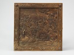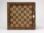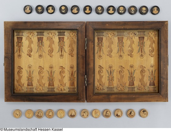 Quadratische, aufklappbare Kassette. Die Außenseite des Deckels auf der Oberseite mit Schachbrett. In den Feldern Einlegearbeit aus farbigen Hölzern, und zwar je eine Blume in den dunklen Feldern, je ein Früchtearrangement in den hellen Feldern. Auf der Schauseite des Deckels reliefierter Reiterkampf in antikisierender Darstellung, die Schlacht bei Zama in Nordafrika mit dem Sieg des Scipio Africanus über Hannibal darstellend. Der Rand des Deckels jeweils mit umlaufenden Blumen in Reliefarbeit, die Seiten und Rahmung der Felder mit Flammleisten. Im Inneren zwei vertiefte Fächer mit Tric-Trac-Feld, Delphine und Fontänen bzw. Obelisken im Wechsel, eingelegt aus verschiedenfarbigen Hölzern und graviert. Rückseitig zwei Messingscharniere mit ornamentaler Gravur, auf der Vorderseite Messingbeschlag zum Verschließen der Schatulle, Schloßblech mit Gravur und Maske. Egerer Reliefarbeit.