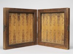 Holz: Ahorn(?), dunkel gebeizt, verschiedene Hölzer, tw. farbig gebeizt, grüne Pappel (?), teilweise Nußbaum, geschnitzt; Metallbeschläge graviert |