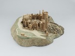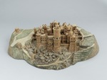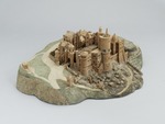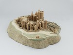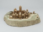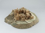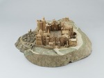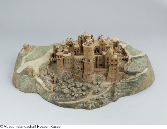 Filigranes detailreiches Holzmodell der Gesamtanlage Löwenburg mit Felslandschaft und Turnierplatz auf unregelmäßig gerundetem Grundriß. Leichte Farbfassung des Geländes sowie der Hofpflasterung. Die Gebäudeteile in Naturholz mit zurückhaltender Farbfassung an Türen, Fenstern und Klappläden. Die Felslandschaft der Wolfsschlucht in Steinen nachempfunden. Aus verschiedenen Resten wurden 1998 das Turnierhaus und Teile des Daches sowie mehrere Mauerstücke wieder ergänzt. Reste kleinster Mauerstücke nicht zuzuordnen.