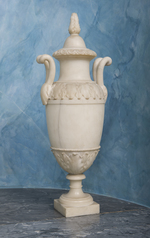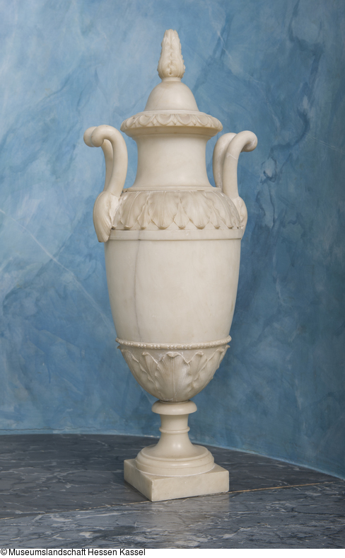 Schlanker, urnenförmiger Vasenkörper auf quadratischer Plinthe. Trichterfuß mit einfach profiliertem Rand, der Schaft durch einen Ring gegliedert. Die Wandung glatt zwischen aufgelegten Blattkränzen, der untere zusätzlich durch einen schmalen Perl - Eierstab abgesetzt. Eingezogener Hals und angearbeiteter Deckel. Der Deckelrand mit Kyma verziert. Knauf in Blattform. Gebogene Doppelhenkel, am Ansatz mit nach unten weisendem Blatt belegt.