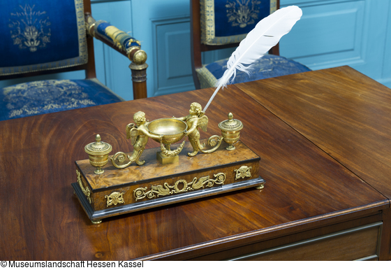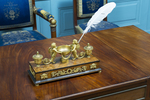 Schreibzeug aus Wurzelholz und Bronze mit aufgelegten ebonisierten Leisten. 4 vergoldete Scheibenfüße, flacher längsrechteckiger Untersatz aus Wurzelholz mit Bronzeappliken. Die Längsseiten mit je zwei seitlichen Blattmasken, dazwischen mittig 2 Schwäne mit Rankenwerk zu Seiten eines zentralen Lorbeerkranzes angeordnet. Die Schmalseiten mit einer Blüten- und Fruchtgirlande, die zwischen zwei Schleifen gespannt ist. Über den ganzen Untersatz reichende, seitlich herausziehbare Schublade. Auf der Oberseite seitlich ein Tinten- und Sandfass aus vergoldeter Bronze in Vasenform mit Reliefdekor. Die Deckel durchbrochen gearbeitet in Form einer Blattgirlande. Einsätze aus Glas. Zwischen Tinten- und Sandfass zwei geflügelte Putten, deren Unterkörper in Blattwerk und Ranken auslaufen und die zwischen sich eine Schale auf profiliertem Fuß halten. In den Händen tragen sie zusätzlich Blüten- und Fruchtgirlanden sowie auf dem Rücken je eine Hülse in Köcherform für Federkiele o.ä.