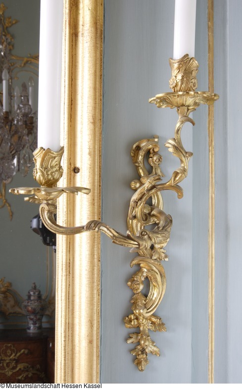 Goldbronze, zweiarmig. An den doppelt S-förmigen Wandstücken Pflanzengehänge mit Blüten und Früchten, die beiden Lichtträger entspringen im oberen Drittel und. reichen verschieden hoch. An dem oberen klettert eine Eidechse, der untere entspringt aus einem Drachenmaul, das sich aus dem neutralen Zweig entwickelt hat. Diese Form kommt an keiner Stelle wieder vor.