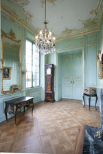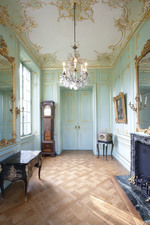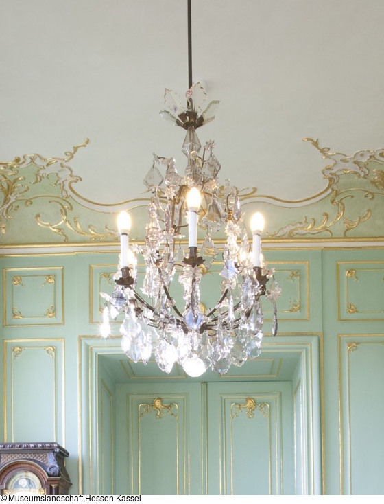 Kleiner Kronleuchter für sechs Kerzen, Bronzegestell mit Glasgehängen u. Aufsätzen wie im Landgrafen-Schlafzimmer.