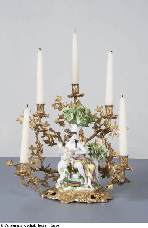 Hoher Bronzeleuchter in Form einer stark verästelten Weinblattranke aus Blättern und Trauben. Astwerk halbkreisförmig geformt mit fünf gleichmäßig verteilten Kerzentüllen. Die Ranke ist am unteren Ende mit einer ovalen, rocaillengeschweiften Fußplatte verschraubt. Mittig befindet sich auf ihr eine plane Auflagefläche für die Porzellanfigur Inv. Nr. 4.1.1045, die von einem reliefierten Blattkranz eingefaßt ist.