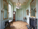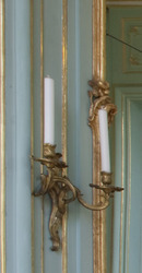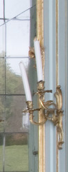 Wandarm für zwei Lichte, am Kaminspiegel, nach außen gewendet ganz unten entspringend und höher heraufragend. Das Gliederwerk durchbohrt, der nach innen gewundete Arm an einem Astknoten abweichend und mit der Lichttülle nur bis zur Höhe des Kelches des ersten heraufragend. Scharfe aber angenehme verschliffene Form.