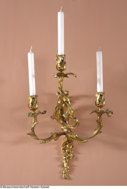 Der mittlere Arm in Form eines kleinen b aber in plastischer Drehung hoch über die beiden seitlichen heraufgereckt, die etwas unterhalb des mittleren entspringend im Rocailleschwung seitlich ausbiegen. Lichtkelche von gewundenen Rocaillen umsponnen, das untere Ende des Mittelzweiges in Pflanzenformen übergehend.