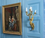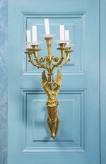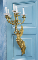 Geflügelte weibliche Gestalt in antikisierendem Gewand, die aus einem Palmettenblattstengel herauswächst, der über zwei am Ende eingerollte Ranken mit 6-blättrigen Rosetten am Wandschild befestigt ist. Die Figur hat beide Arme über den Kopf erhoben und trägt einen zylindrischen, unten mit einer Rosette und oben mit einem Blattkranz geschmückten Aufsatz in den Händen. Daraus wachsen 4 gebogte, geteilte und mit Blättern belegte Leuchterarme hervor. Scheibenförmige Tropfschalen, die Unterseite mit Blattkranz und ornamentalem Dekor reliefiert. Kurze, gedrungene Kerzentüllen. Zwischen den 4 gebogten Leuchterarmen senkrecht angeordnet der 5. Leuchterarm mit nach unten verjüngtem Schaft und trichterförmiger Kerzentülle. Der Schaft mit Blattformen reliefiert, die Tülle mit Rippenmotiv und stark stilisiertem Blattfries. Französische Arbeit.