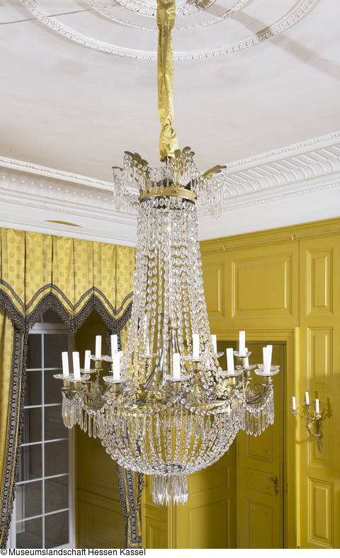 Vergoldetes Bronzegestell mit reichem Behang. Ornamentierter Bronzereif, von dem 12 gebogte Leuchterarme abgehen und nach oben hin weitere 6 aufrechte Leuchterarme ansetzen. Zwischen die 12 Leuchterarme sind Rosetten eingefügt, zwischen die oberen Arme durchbrochen gearbeitete Motive von auf Streitwagen fahrenden Figuren (Helios mit dem Sonnenwagen ?) Die Kerzentüllen der oberen Leuchterarme auf einer flachen, gedrungenen Säule mit seitlichen Voluten aufsetzend. Der Reif über 6 gebogene Stäbe an einem zentralem Stab befestigt, die Stäbe setzen an einer flachen Scheibe mit 6 Blattakroteren an, nach unten schließt der zentrale Stab in einer mit Blattrelief belegten Scheibe und einem hängenden Zapfen ab. Oberer Abschluß durch einen ziselierten Reif, von dem 6 Palmettenakrotere aufsteigen. Behang aus Lüsterketten mit ovalen und runden Steinen sowie Eisbirnel.