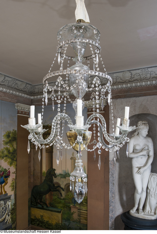 Lüster in venezianischer Art. Mittelstab mit drei Glaskörpern unterschiedlicher Größe verkleidet. Darunter ein vergoldetes, kelchförmiges Zwischenstück, an dem 6 geschwungene, facettierte Leuchterarme mit blütenförmigen Glastropfschalen ansetzen. Unterer Abschluß des Mittelstabes mit 4 scheibenförmigen Glasgliedern verkleidet, 3 davon gerippt. Darunter befindet sich ein glockenförmiger Glaskörper mit Randbehang aus 6-eckigen Lüstersteinen und Eisbirnel; mittig ein großer, geschliffener Glastropfen an Bronzeaufhängung. Über den Leuchterarmen zwei Glasreifen, der obere kleiner. Die Reifen bestehend aus einem Bronzegestell, das mit Lüstersteinen verkleidet ist. Oberster Abschluß in Form eines nach unten weisenden schalenartigen Glaskörpers. Lüsterketten verbinden die Reifen miteinander, die Leuchterarme untereinander sowie diese mit den Reifen. Sparsamer Behang aus Eisbirnel und Lüstersteinen unterschiedlicher Form.