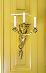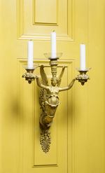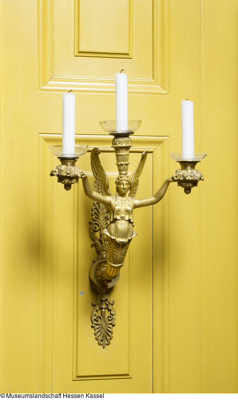 Figürlicher Wandleuchter mit 3 Leuchterarmen. Wandschild bestehend aus einer Scheibe mit ornamentiertem Rand, oben und unten setzt je ein vegetabiles Anschlußstück mit Palmettenblattenden an. Von der Scheibe ausgehend plastischer Blattstengel, aus dem eine geflügelte weibliche Gestalt in antikisierender Kleidung herauswächst. Mit ausgebreiteten Armen hält sie in jeder Hand einen mit Blumen und Früchten gefüllten Korb, auf den Kerzentüllen aufsetzen. Auf dem Kopf dreifach gestufte Vase mit Blütenkranz und Kerzentülle.