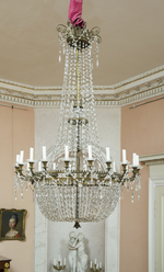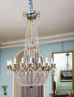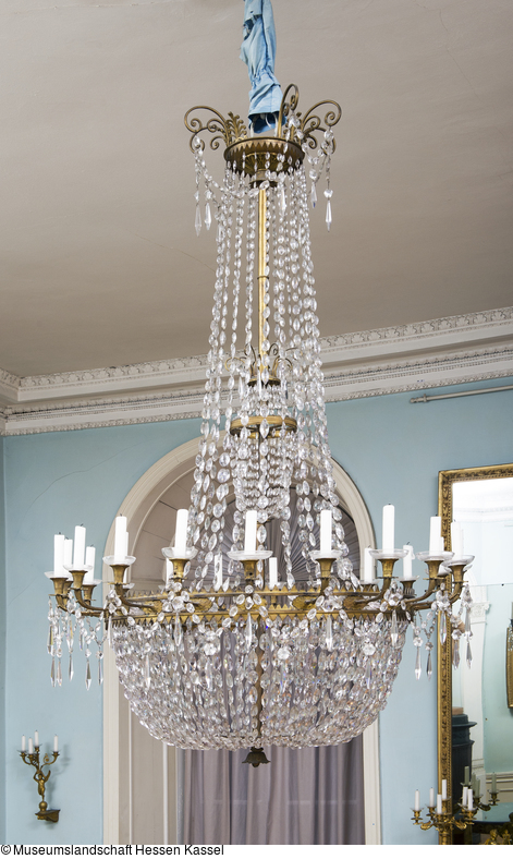 Vergoldetes Bronzegestell mit reichem Behang. Durchbrochener Reif, nach oben und unten mit Zackenleiste abschließend. Daran angesetzt 20 gebogte Leuchterarme, die von flachen Blattkartuschen ausgehen. Der Reif über 5 flache Stege an einem zentralem Stab befestigt. Unterer Abschluß des Gestells in Form einer flachen Scheibe mit 2 stilisierten Blattfriesen und kleinem Knauf inmitten eines stilisierten Blattkranzes. Oberer Abschluß scheibenförmig mit aufgelegtem reliefiertem Blattkranz. Nach oben hin 8 sich doppelt einrollende Stäbe und durchbrochene Palmettenakrotere. Unter der Bekrönung kleiner, über 6 Stege am Mittelstab befestigter Reif, darüber kleine Scheibe mit 6 eingerollten und 6 gebogten Stäben. Behang aus Lüsterketten, die Steine rund bzw. spitzoval. Zwischen den Leuchterarmen und am oberen Abschluß Lüsterketten mit zusätzlichem Behang aus Eisbirnel.