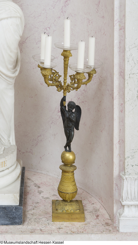 Figürlicher Leuchter mit einem stehenden, geflügelten Amor als Lichtträger. Auf quadratischer Basis der balusterförmig gebildete Sockel mit Fuß aus reliefiertem Blattkranz. Die Wandung des Sockels in 5 horizontale Zonen geteilt, die unterste mit reliefiertem Blattdekor, die übrigen mit kleinteiligem, teils vegetabilem, teils rein ornamentalem Dekor. Am oberen Ende über scheibenförmiger Erweiterung Kugelaufsatz als Standfläche für den vollplastischen Amor. Die Figur ist schräg von rechts dargestellt, dunkel patiniert, nackt bis auf ein umgegürtetes Tuch, das die Scham verdeckt. Der linke Fuß ist leicht über den rechten geschlagen, der linke Arm erhoben, die Hand ans Kinn geführt. Der Kopf ist etwas geneigt und zur linken Schulter gedreht, der rechte Arm in Kopfhöhe gehoben, die Hand hält den Leuchteraufsatz. Der Aufsatz mit erhöhtem, sich konisch erweiterndem Mittelteil. Davon ausgehend 4 gebogte Leuchterarme mit je zwei eingerollten Rankenzweigen. Die Kerzentüllen mit Fruchtkranzdekor; alle 5 Leuchterarme mit reliefiertem Blatt- bzw. Ornamentdekor.