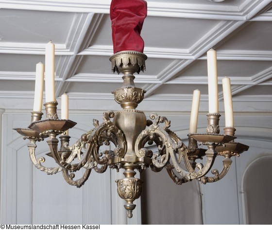 Kronleuchter, Bronze, gegossen. Bestehend aus einem Lampenkörper und acht einsteckbaren Armen. Der Lampenkörper besteht aus einem Lambrequin oben, darunter ein Kelch oder eine umgedrehte Glocke, die mit fein ziseliertem, aufgelegtem Akanthus verziert ist, darunter ein achteckiger Baluster, in dessen auskragende Basis acht Arme für acht Kerzen eingesteckt sind. Die Muttern unterhalb zum Festhalten sind als kleine Blüten gestaltet. Nach unten hin endet der Lampenkörper wieder in einer umgedrehten Glockenform, die mit Akanthus verziert ist, dessen Blätter fein ziseliert sind. Die Arme sind Schwünge mit Akanthus und Voluten, die großen Lichtmanschetten sind achteckig und am Ansatz zu den Armen mit Akanthus belegt..