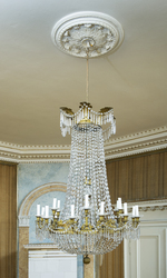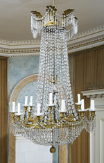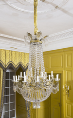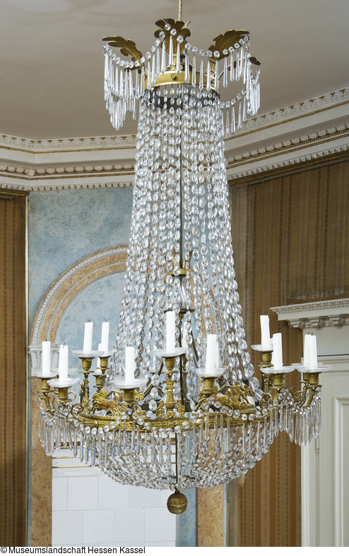 Korblüster bestehend aus vergoldetem Metallgestell mit reichem Behang. Mittelstange mit 3 Reifen. Von dem unteren, mit vegetabiler Ornamentik geschmückten Reif gehen 12 gebogte blattverzierte Leuchterarme ab, während nach oben hin weitere 6 Leuchterarme aufrecht ansetzen. Zwischen die gebogten Arme sind Rosetten gesetzt, zwischen die oberen Arme durchbrochen gearbeitete Darstellungen einer auf einem Wagen fahrenden Figur (Helios mit dem Sonnenwagen ?). Die Kerzentüllen der oberen Leuchterarme auf einer flachen, gedrungenen Säule mit seitlichen Voluten aufsetzend. Der Reif ist über 6 gebogte, an einer Scheibe ansetzenden Stäbe mit dem Mittelstab verbunden. Dieser schließt nach unten in einer Blattrosette und einem blattverzierten kugeligen Knauf ab. Über der Scheibe ein bauchiges Glaselement, das durch einen Bronzereif mit 6 Blattakroteren abgeschlossen wird. Oberer Abschluss des Lüsters in einem weiteren Bronzereif, von dem 6 Palmettenakrotere abgehen. Behang aus Lüsterketten mit ovalen und runden Steinen sowie Eisbirnel.