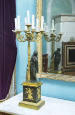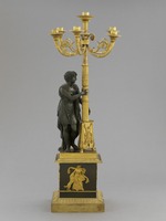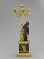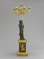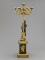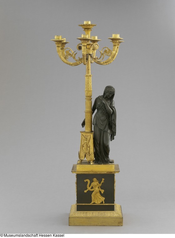 Sechsflammige figürliche Girandole. Hoher Sockel auf rechteckigem Grundriss aus vergoldetem und geschwärztem Metall. Unten umlaufend Blattfries. Auf drei der geschwärzten Sockelseiten je eine vergoldete Applikation: auf der Front antikisierend gekleidete Frau mit Schmetterling, links Mann mit zwei Schlangen in der Linken (Asklepios ?), rechts Frau mit zwei Adlern. Auf dem Sockel in Kontrapost stehende antikisierend gekleidete Frau (Vesta ?) aus geschwärztem Metall, links hoher vergoldeter sechsflammiger Kandelaber. Kandelaber mit dreiseitigem Sockel, auf jede Seite ist eine geflügelte Frau mit Räucherschalen in den Händen appliziert. Hoher, blattverzierter Stamm. Davon ausgehend fünf nach oben gebogte blattverzierte Leuchterarme. In Verlängerung des Stammes ein weiterer Leuchter, der die anderen überragt. Trichterförmige Tropfschalen, gezackte Tüllen später ergänzt. Alte Bezeichnung: Schloß Wilhelmshöhe Z. 55 Nr. 20; Inv.Verz. Wilhelmshöhe Bd. Ia S. 195.