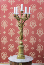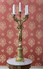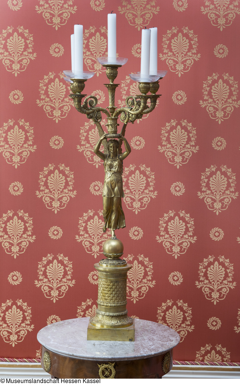 Auf quadratischer Plinthe kurzer Säulenschaft, unten Blattkranz, auf der Wandung flächendeckender ziselierter Blütendekor. Mit einem Bein auf einer Kugel stehende Viktoria, die Arme erhoben und einen Blütenkranz mit fünf Leuchterarmen haltend. Vier der Leuchterarme im Dreiviertelkreis angeordnet, gebogt und blattverziert, davon abzweigend nach oben und unten Voluten. Der mittlere Leuchterarm in Form eines Palmstammes, die vier anderen überragend. Vasenförmige, blattverzierte Tüllen.