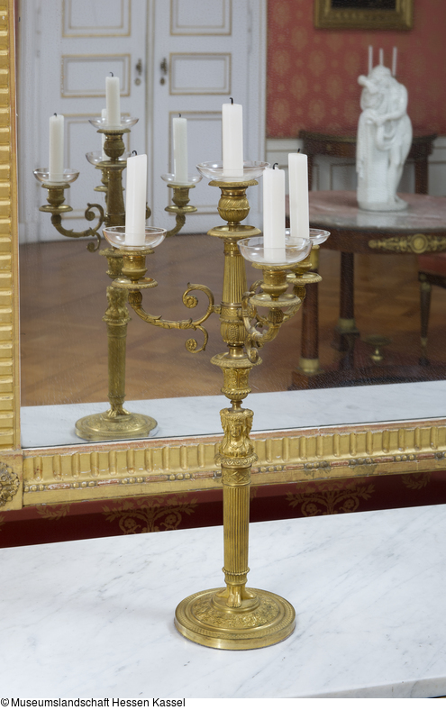 Vierflammiger Leuchter auf Rundfuß mit Efeukranz und Rosetten. Hoher gerippter Schaft in ägyptisierender Art, oben drei reliefierte Frauenbüsten, unten drei dazugehörige Fußpaare. Die Köpfe der Frauenbüsten tragen eine trichterförmige Tülle, in die ein ( herausnehmbarer ?) vierflammiger Leuchteraufsatz eingelassen ist. Leuchteraufsatz in Form einer mehrfach gegliederten Säule, davon abzweigend drei gebogte, blattverzierte Leuchterarme, am Ansatz nach unten und oben gebogte Voluten. Blattverzierte Tüllen. Mittig erhöht auf der Säule vasenförmige Tülle mit Blattkranz.