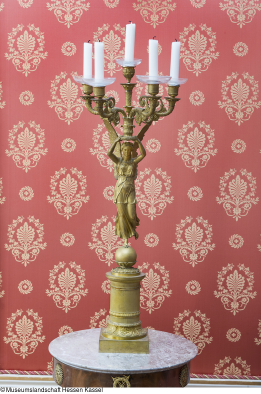 Auf quadratischer Plinthe kurzer Säulenschaft, unten Blattkranz, auf der Wandung Kannelur. Mit dem rechten Bein auf einer Kugel stehende Viktoria, die Arme erhoben und einen Blütenkranz mit fünf Leuchterarmen haltend. Vier der Leuchterarme kreisförmig angeordnet, gebogt und blattverziert, davon abzweigend nach oben und unten Voluten. Der mittlere Leuchterarm in Form eines Palmstammes, die vier anderen überragend. Mittig vasenförmige, blattverzierte Tülle, außen zylindrische Tüllen mit Kannelur.