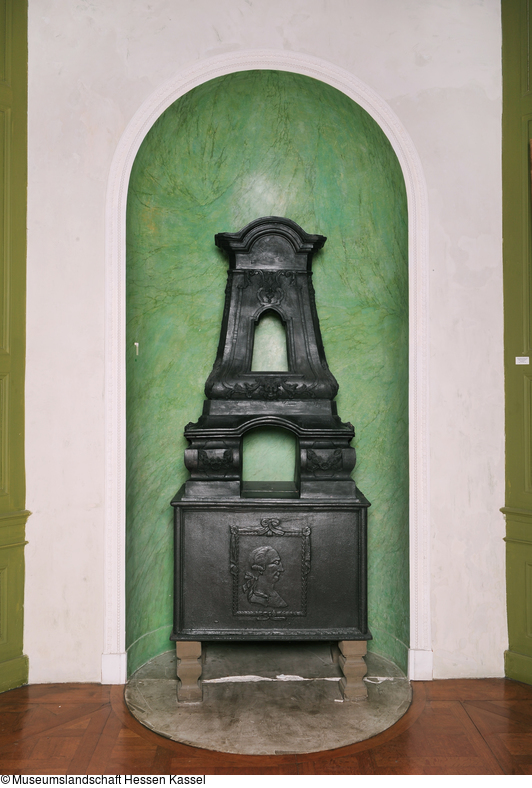 Gußeiserner Ofen auf 4 balusterartigen Steinfüßen. Rechteckiger Feuerkasten, 3-seitig geschlossen mit 3 Ofenplatten. Die Platten mit erhöhtem, profiliertem Rand und Reliefdarstellung. Auf den Schmalseiten das Wappen der Landgrafschaft Hessen unter Fürstenhut, vor Zopfgehänge und Lorbeerzweigen. Auf der Vorderseite mittig Männerkopf mit Zopfperücke im Profil, umrahmt von rechteckigem Rahmen aus Lorbeerstab, Schleifen und Draperie. Durchbrochener 2-etagiger Zirkulieraufsatz aus Ton, profiliert, gekehlt und wulstig durchgebildet, in vielfach profiliertem Gesims endend. Aufgelegte Reliefdekoration aus Ranken, Girlanden, Maskarons und Zopfwerk. Von der Rückseite zu beschicken.