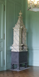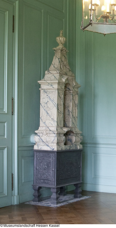 Unterteil Gußeisenplatten, rechteckig auf vier Füßen. Oberteil in Keramik mit marmorierter Bemalung, torartig in einer Bekrönung. (Vase in fruchtartigen Formen ) oben endend. Stilr. Rokoko