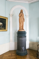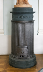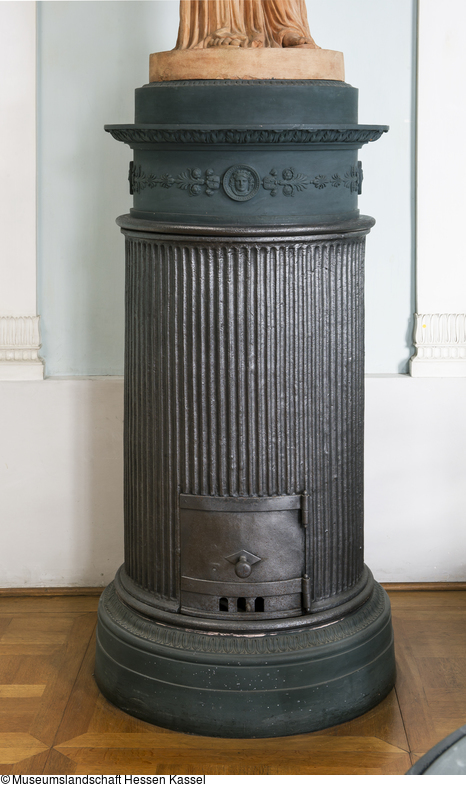 Rundofen mit Sockel und Aufsatz aus Terrakotta. Vorkragender, profilierter und mit Zungenblattfries dekorierter Sockel. Darauf kannelierte Eisentrommel. Auf der Vorderseite Ofenklappe zur Befeuerung mit eingebauter Zugregulierung. Zylindrischer Aufsatz, umlaufend dekoriert mit Köpfen in Rundmedaillons, dazwischen vegetabile Ornamentik aus Palmetten, Rosetten und Akanthus. Vorspringendes Gesims, die Karniesleiste mit Blattfries verziert. Darauf kurzer zylindrischer Sockel, der obere Abschluss mit Zungenblattfries, als Träger für die Ofenaufsatzfigur.
