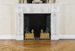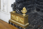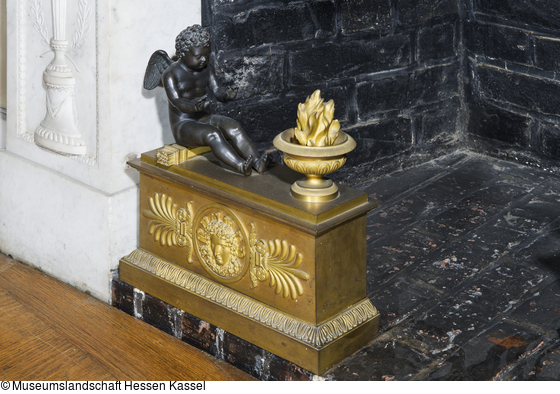 Teilvergoldeter Kaminvorsatz mit figürlichem Aufsatz. Hoher, längsrechteckiger Sockel, 3-seitig gearbeitet mit offener vierter Seite. Vorspringende Sockelplatte mit Blattfries. Auf der Vorderseite des Mittelteils mittig im Rund langhaariger Maskenkopf mit Strahlen- oder Flügelkranz (Apoll ?) zwischen Palmettenblättern. Vorspringende Deckplatte mit Karniesleiste. Auf der Oberseite ein auf seinem Köcher sitzender vollplastischer Amor, Hände und Füße einer ihm gegenüberstehenden Feuerschale entgegengestreckt. Die Schale mit Rillen und stilisiertem Blattfries verziert. In ihr ein durch bewegte Formen gebildetes Feuer.