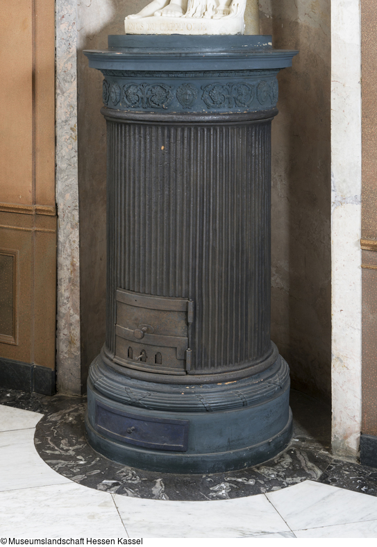 Rundofen mit Tonaufsatz. Kannelierte Eisentrommel auf breitem, mehrfach profiliertem Unterteil. Dieses auf der Vorderseite mit Aschenkasten, darüber umlaufendes Dekorationsband in Form von Stäben o.ä., die in regelmäßigen Abständen durch Bänder zusammengefaßt werden. Am unteren Ende der Eisentrommel vorne Ofenklappe zur Befeuerung mit eingebauter Zugregulierung. Tonaufsatz mit umlaufendem Reliefdekor aus Medusenmasken im Wechsel mit einem symmetrisch gestalteten Weinblatt, -trauben und Rankenmotiv. Profilierter, vorkragender oberer Abschluß auf stilisiertem Blattfries. Ofenrohr auf der Rückseite noch angeschlossen.
