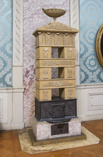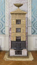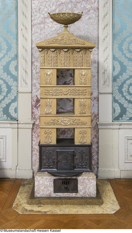 Etagenofen, bestehend aus vier Teilen. Sockel aus Stukkolustro mit Aschekasten und Zugregulierung, oben umlaufend Blattfries aus Irdenware. Brennraum aus vier geschwärzten Eisengußplatten mit Reliefdekor. Schmalseiten und Frontseite mit hochstehendem Akanthusblattmotiv. Auf der Ofentür üppig mit Blumen und Früchten gefüllter Korb auf Blattsockel. Vorne halbkreisförmiger Vorsprung. Auf der Rückwand zwei Greifen, dazwischen gefüllter Weidenkorb auf Akanthusblattsockel. Keramikaufsatz mit Rauchabzugführung über sechs Etagen, Vorderseite mit Reliefdekor. Drei Etagen mit offenem Mittelteil zeigen Delphinenpaar mit Akanthus bzw. Sphingen mit Kandelaberleuchter im Zentrum oder Schwäne zwischen Füllhörnern. Die beiden geschlossenen Etagen weisen Groteskenwerk auf: Maskaron vor Strahlenkranz mit Füllhörnern in querovaler Kartusche, flankiert von grotesken trompeteblasenden Engeln bzw. Engelherme mit Blüten-Frucht-Girlande, seitlich Akanthus mit Fackeln. Die obere Etage zeigt auf drei Seiten kräftigen Blattfries, rückseitig Abzugsrohr. Giebelabschluß mit zwei schleifengebundenen Blütenzweigen, mittig Lyra. Die Ofenbekrönung besteht aus einer ovalen Fußschale mit durchbrochenem Rand. Fuß und Schalenansatz kanneliert. Seitlich Handhaben in Form plastischer Palmetten. Durchbruchsarbeit mit Blüten und Rosetten. Bodenplatte der Schale mit eingeritzter ''No. 2108'' (wohl Ofenmodellnummer), darauf Reste der ursprünglichen Ofenbekrönung erkennbar. Lt. Altkarte alte Bezeichnung: ''Schloß Wilhelmshöhe 106 / b''.