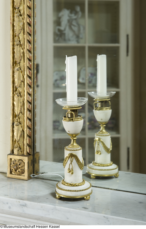 Kerzenleuchter aus Marmor und vergoldeter Bronze. Runder Marmorsockel auf drei gedrückten Kugelfüßen, die Oberseite des Sockels flach gekehlt. Aufgelegter Kugelstab und gewundener Bandstab. Zylindrisches Podest für Vasenaufsatz, von Bronzegirlande mit Quasten umschlungen. Oben aufgelegter Kugelstab. Vase mit Bronzefuß in Trichterform und Blattkranz als Aufsatz für den Gefäßkörper aus Marmor. Schulter, Hals und Henkel aus Bronze, der Hals gleichzeitig die Kerzentülle darstellend.