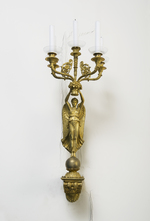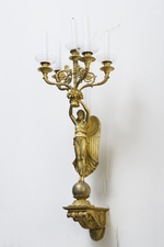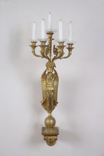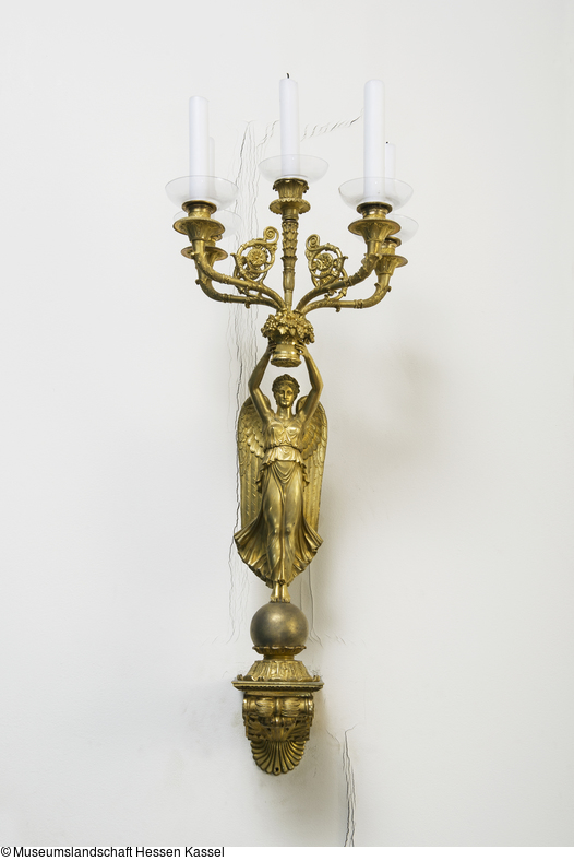Wandleuchter, bestehend aus einer blattverzierten Konsole, auf der sich ein fünfflammiger figürlicher Beleuchtungskörper erhebt. Mit geschlossenen Beinen auf einer vollplastischen Kugel stehende Viktoria in antikisierendem Gewand, die Arme nach oben gestreckt. In ihren Händen hält sie einen üppig mit Früchten und Blattwerk gefüllten Korb, aus dem vier blattverzierte, s-förmig gebogte Leuchterarme mit Tüllen und Tropfschalen emporragen. Im Zentrum des Korbes erhebt sich ein einzelner, die gebogten Arme überragender Leuchter mit einem Schaft in Form eines Palmenstammes.
