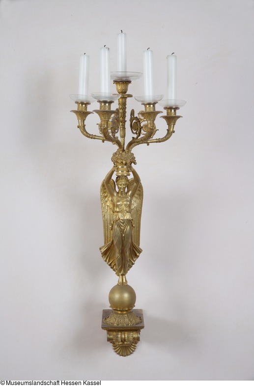 Wandleuchter, bestehend aus einer blattverzierten Konsole, auf der sich ein fünfflammiger figürlicher Beleuchtungskörper erhebt. Mit geschlossenen Beinen auf einer vollplastischen Kugel stehende Viktoria in antikisierendem Gewand, die Arme nach oben gestreckt. In ihren Händen hält sie einen üppig mit Früchten und Blattwerk gefüllten Korb, aus dem vier blattverzierte, s-förmig gebogte Leuchterarme mit Tüllen und Tropfschalen emporragen. Im Zentrum des Korbes erhebt sich ein einzelner, die gebogten Arme überragender Leuchter mit einem Schaft in Form eines Palmenstammes. Lt. Altkarte altes Klebeetikett ''Schloß Wilhelmshöhe Z. 57 Nr. 29''.