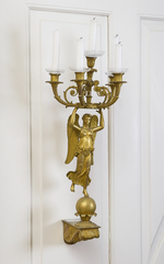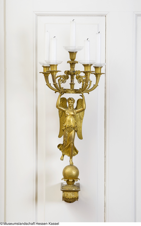 Wandleuchter, bestehend aus einer lorbeerblattverzierten Konsole, auf der sich ein fünfflammiger figürlicher Beleuchtungskörper erhebt. Mit dem linken Bein auf einer vollplastischen Kugel stehende Viktoria in antikisierendem Gewand, die Arme nach oben gestreckt. In den Händen hält sie einen blütenbesetzten kreisrunden Reif, an dem vier blattverzierte, gebogte Leuchterarme mit Tüllen und Tropfschalen emporragen. Im Zentrum erhebt sich ein einzelner mehrgliedriger Leuchterarm mit einem Kranz aus nach unten gebogten Blättern.
