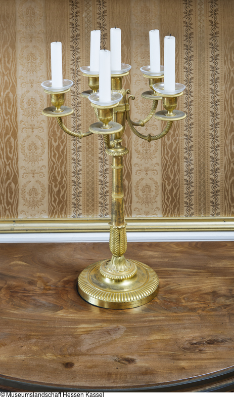 Sechsflammiger Leuchter auf gestuftem Rundfuß mit radialem Rippendekor. Hoher, mehrfach gegliederter Säulenschaft, am Ansatz zwei Blattkränze. Vasenförmiger erhöhter Aufsatz, davon ausgehend fünf gebogte, z.T. mit spiralförmigen Rillen versehene Leuchterarme. Breite Tropfschalen und glockenförmige Tüllen.