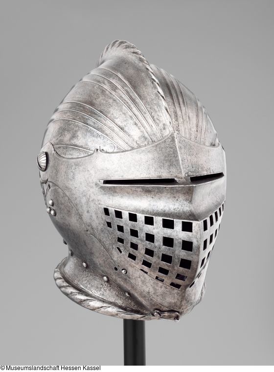 Vierteiliger Visierhelm, der am Kamm und am Kragen kräftiges Tauornament trägt. Das Visier ist durch eine Schnappvorrichtung mit der rechten Wange verbunden. Helm und Kragen weisen ein derbes Ätzornament auf, das sich durch Abwehr- und Spottgesten der Hand wiederholt auszeichnet, und vermutlich sehr viel später zwecks Wertsteigerung ausgeführt wurde. Teil der Rüstung W. 4. Vermutlich Harnisch Philipps des Großmütigen. Möglicherweise von Wolfgang Großschedel (mündliche Aussage Dirk Breiding, 2019).