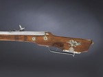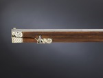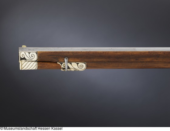 Großer, runder Lauf, nach zweifacher Abschnürung im untersten Teil fünffach abgekantet. Zielrinne im Unterlauf eingeschliffen. Eisenkimme, linsenförmiges Messingkorn. Der Schaft beiderseits gekehlt. Im Schaft Vorrichtung zum Einschieben des Ladestocks. Ladestock mit einfach graviertem Knochenabschluß und Knochenhalter, ebenso Abschlußband unterhalb der Mündung. Einfaches Radschloß mit Schnapphahn in üblicher Drachenform. Hahn und Rad auf flacher Eisenplatte sitzend. Großer Abzugsschutz, hinten abgekantet. Keine Stechvorrichtung. Kolben abgeflacht und abgekantet mit Kugelkasten und Wangenauflage. Dem Schloß gegenüber zwei gravierte Rosetten in Knochen. An der Wangenauflage Adler auf Rosette mit erhobener Klaue. Dünnes Streuornament am Lauf oberhalb der Kimme und am Ansatz des Laufs eingeschlagen. Marke fehlt. Über der Pulverkammer P. S. eingeschlagen.