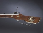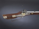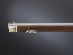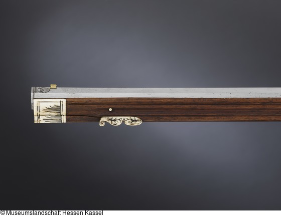 Achtkantiger, durchgehender Lauf von dicker Wandung. 6 Züge. Doppelte Stahlkimme, Messingkorn. Am Schaft Vorrichtung zum Einschieben des Ladestocks. Ladestock durch Band in Knochen am Schaft befestigt. Ladestock mit knochenverkleidetem Ende. Schloß aus graviertem Stahl mit Schnapphahn in Drachenform. Messingornament um den Radschloßstift. Großer Abzugsschutz mit Dreifingerwelle, hinten abgekantet. Stechvorrichtung, abgebrochen. Kolben abgeflacht und abgekantet mit Kugelkasten und Wangenauflage. Kolbenabschlußplatte aus Horn. Knocheneinlagen auf Kugelkasten, Mündung und Wange konzentriert: An der Wange in liegendem ovalem Feld: Hirschkuh vor Baum und Baumstümpfen. Eingeschlagenes, spitzes Ornament in Holz. Gravierte Jagddarstellungen an den Stahlteilen des Schlosses und Doppelwappen am Messingornament um den Schloßstift. In der Stahlfläche eingraviert: SVLA.