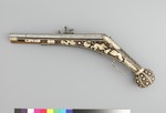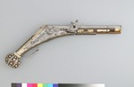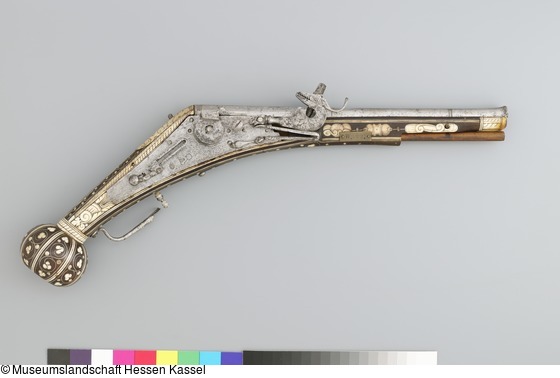 Radschloßpistole mit gravierten Knocheneinlagen und Kugelknauf. Eingeschlagene Marke: S P D dazu Nürnberger Schild auf der Oberseite des Laufes. Lauf im Vorderteil rund, im hinteren Teil abgekantet. Reiche Einlagen aus Bein mit Gravuren über Schaft. Laufschäftung und Knauf: Löwen, Delphin und Masken, Beschlagwerk und Blätter. Schloßplatte mit 2 weiteren Schlagmarken: eins davon ein Blatt, Luntenhahn in stilisierter Drachenform mit vegetabiler Gravur. Auf Oberseite des Laufes datiert.