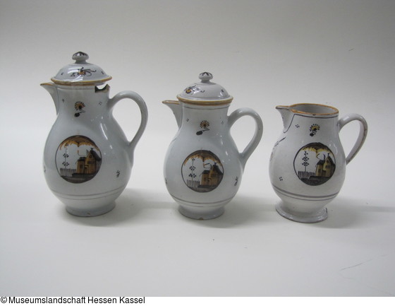 Kaffeekännchen mit Haus und Baum in kreisrunden Medaillons und Streublumen